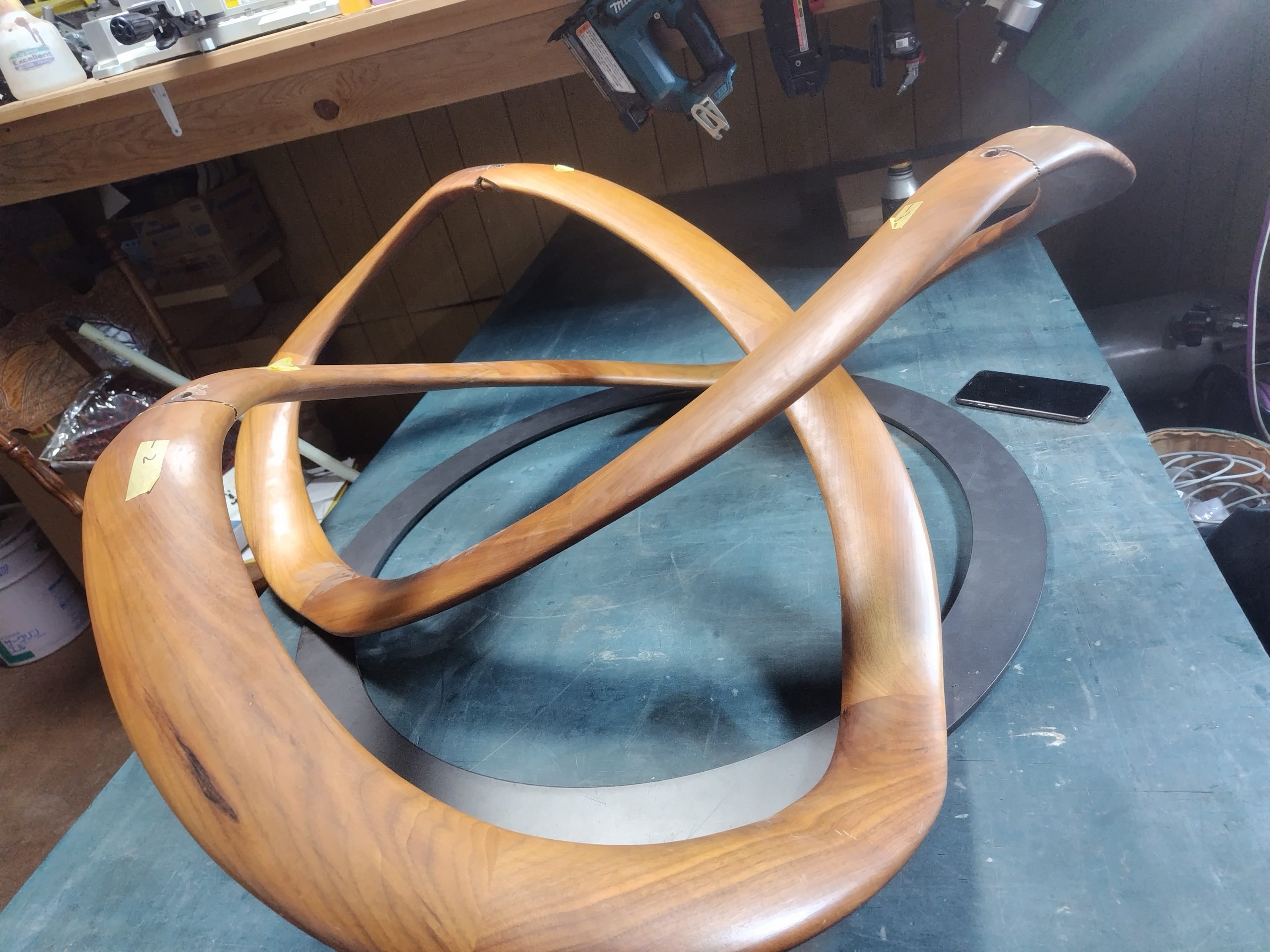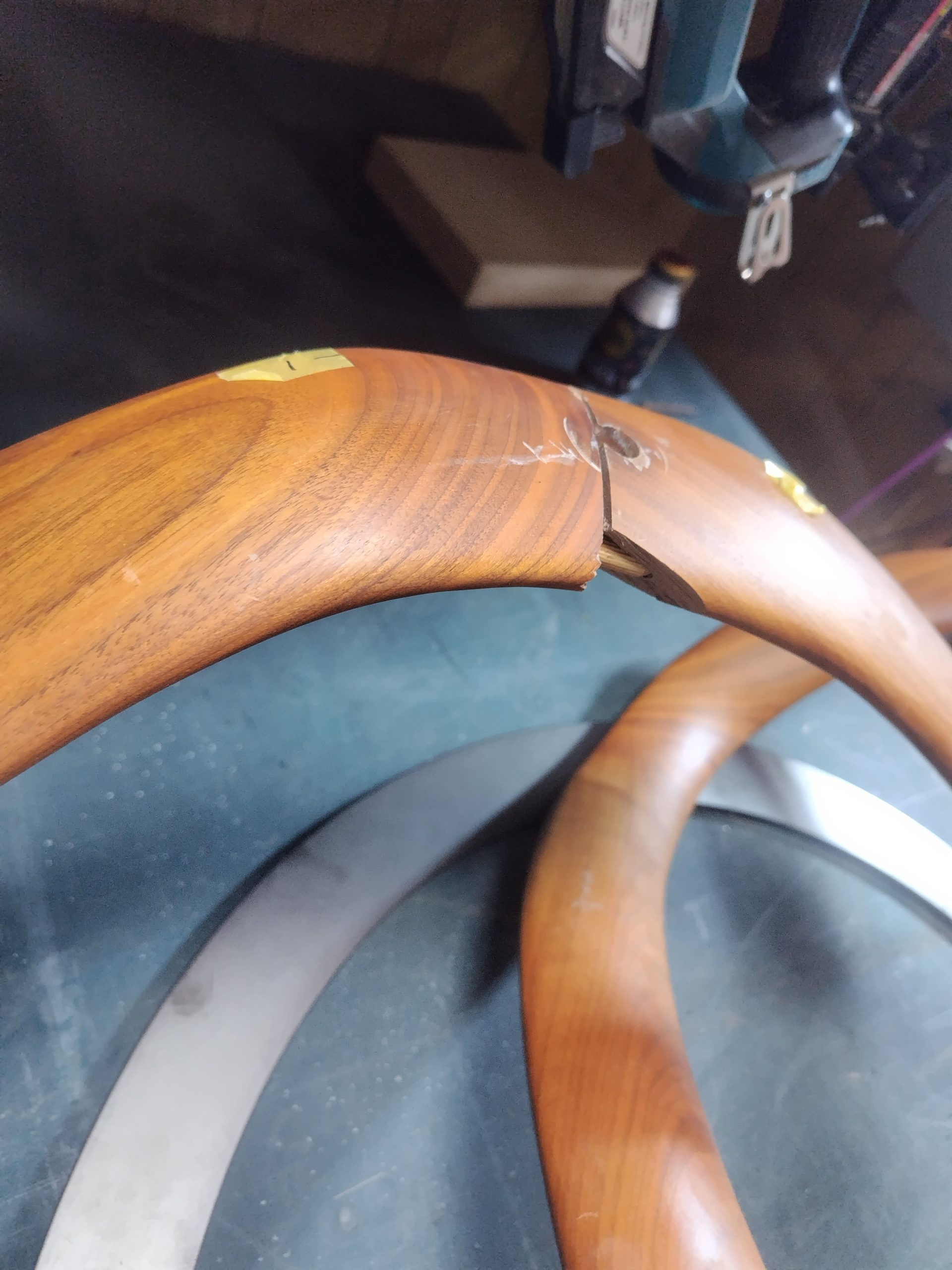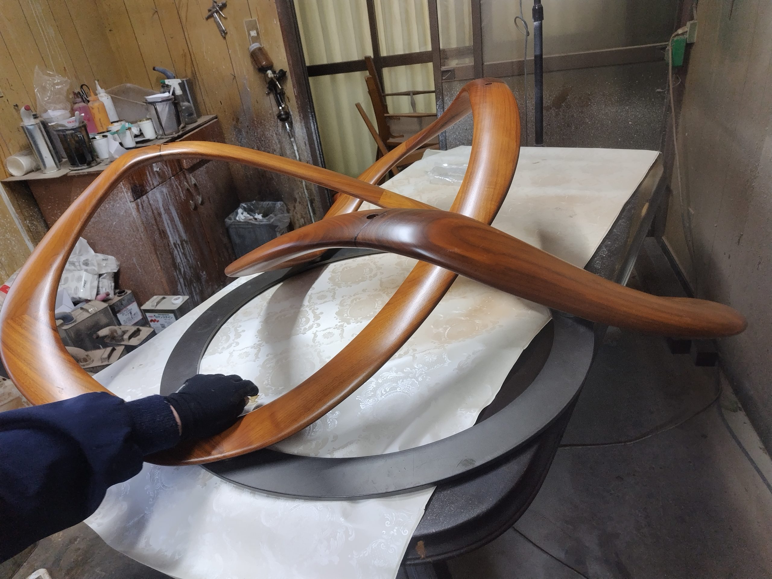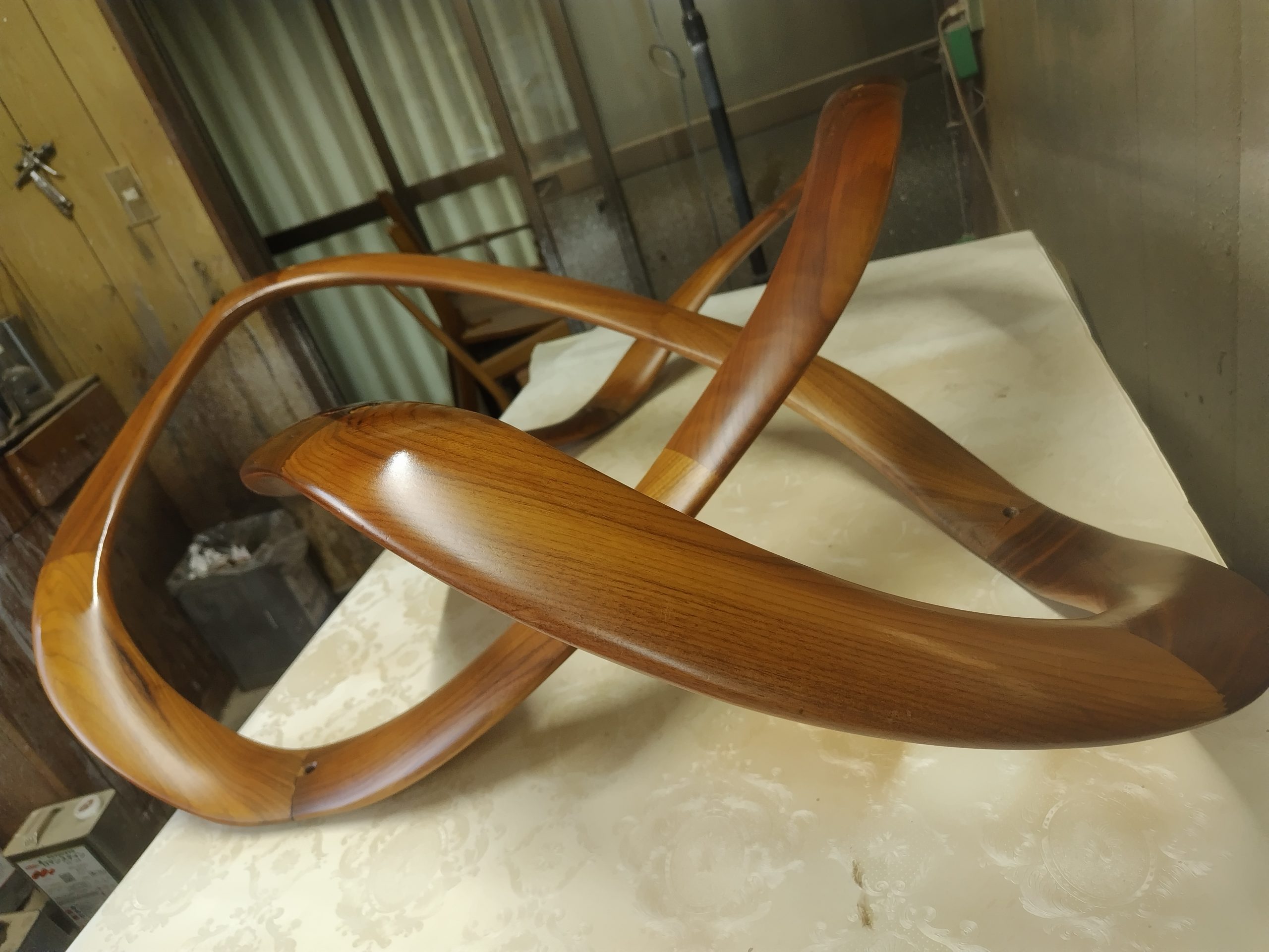 曲線が美しい家具ですが、接合部分のダボが折れてしまったので、強度が出るように、ダボ加工と接着圧着にて修理を行いました。修理後は綺麗に塗装もしましたよ🤞 高価な家具なので、また使えるようになって良かったです…☺️