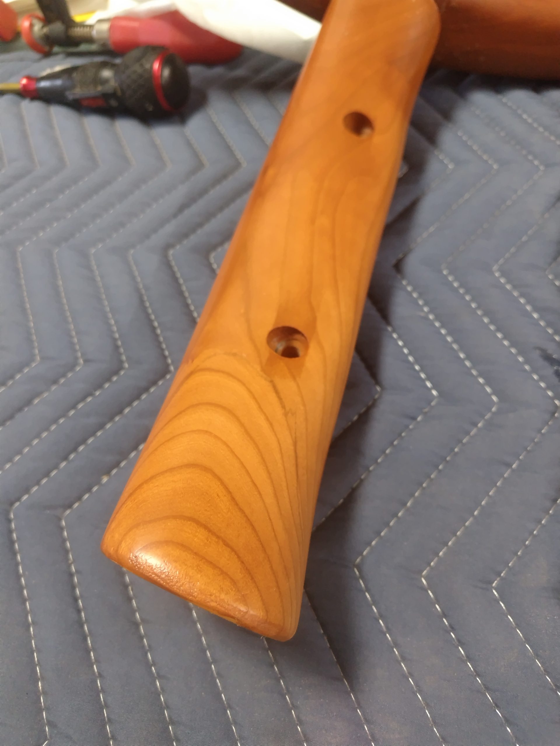 椅子の裏側が割れてしまいました。破片の補修です。 割れた所がなるべく分からないように補修をします。 接着して、削って着色して塗装仕上げすると、割れたのどこだっけ?を目指して補修しています☺️